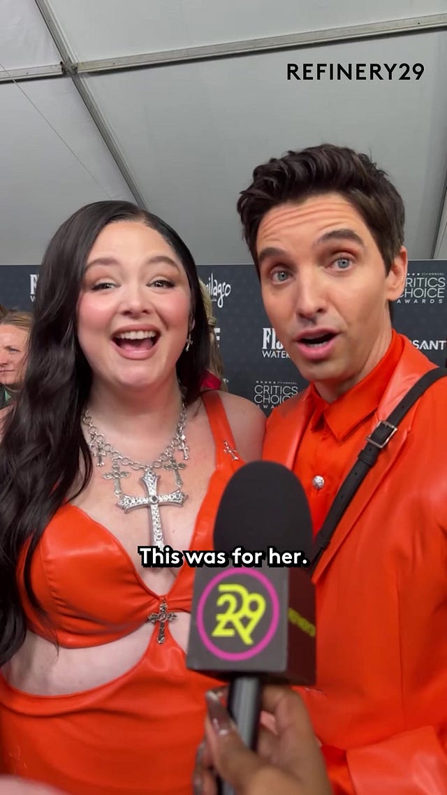 Hacks stars Meg Salter and Paul W. Downs parodied Kylie Jenner and Timothée Chalamet’s orange Marty Supreme outfits at the Critics Choice Awards over the weekend and the result was chef’s kiss. Downs told Refinery29 on the carpet, “It’s like, reduce, reuse, recycle, rewear, you know? That’s the thing.”