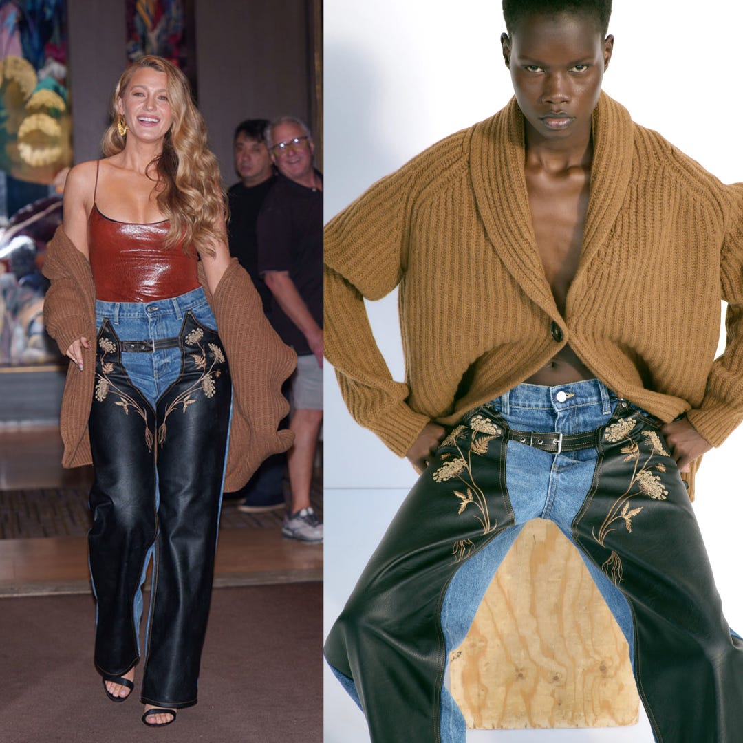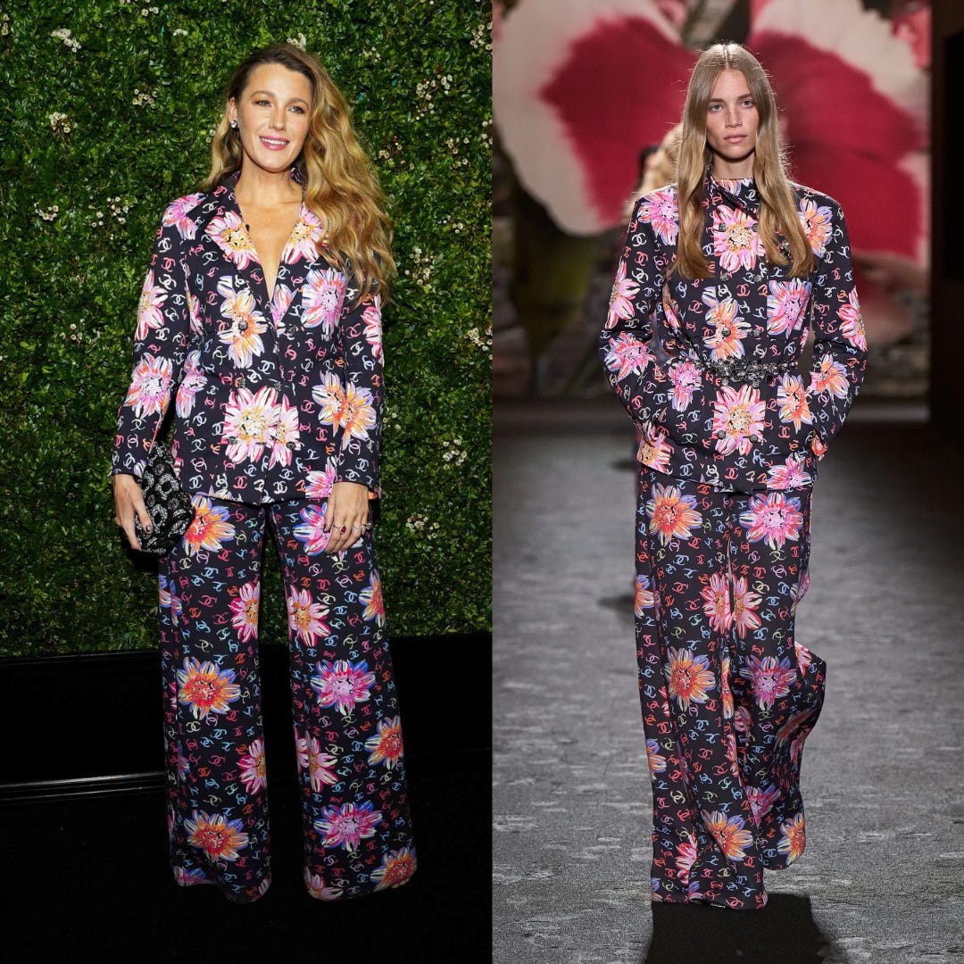 So far during her floral-themed month, Lively has worn several floral looks by Dauphinette; a pair of $19,000 Valentino floral jeans; a custom Versace catsuit for the Deadpool and Wolverine premiere; more floral denim jeans by Chanel with a matching top and bag; a pajama-esque floral look by Chanel; a full Versace resort look including yellow tights; and jeans with faux leather chaps and a coordinating chunky cardigan by Stella McCartney.