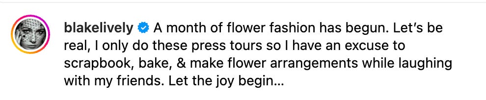 People has called Lively “the queen of method dressing,” noting that “she was doing it as early as 2018, when she committed to tailored suits while doing promo for A Simple Favor.” In that (incredible) movie, she played an intimidating-yet-alluring fashion PR executive living in a modern house with her hot husband in a leafy New York City suburb who wore outré pantsuits and wide-brimmed hats that harkened to the strangeness of Lively’s actual red-carpet style.