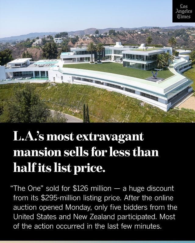 A piece of real estate in Los Angeles known as “The One” just sold for $141 million. It is 105,000 square feet and was listed as a residence, but is clearly an office building for a consortium of YouTube creator collectives. Just look at this L.A. Times photo of its “floating lounge” and tell me this water has been both chlorinated within the last three years and graced by human beings who subsist on foods other than sugar cereal in oat milk.