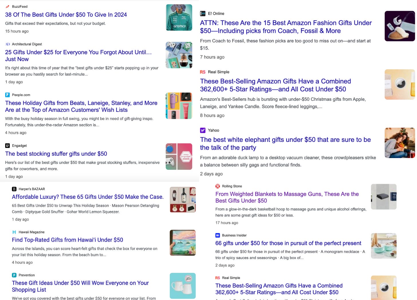 As traffic from social media faded in the 2010s and ad revenue declined, search became the dominant traffic funnel and affiliate revenue became a bigger priority. Executives started emailing charts around to all the editors, showing what percentage of revenue came from affiliate, which was directly tied to SEO rankings. Generic shopping stories became terribly important. And gift guides were seen as the king of this content.