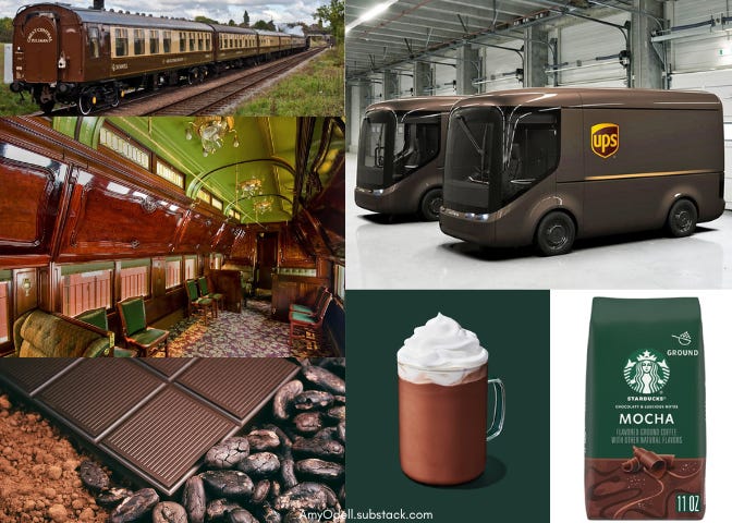 The evolution of brown itself is fascinating. U.P.S. chose brown as its color because it was associated with Pullman trains, luxury railcars popular in the nineteenth and early twentieth centuries. As perceptions shifted, brown felt less like a color of luxury, and rather one that symbolized durability. Around 2000, we saw what Pressman called the “Starbucks phenomenon,” which altered the meaning of brown once again. “Brown started to be about mochaccinos and chocolate fudge — the chocolate and coffee culture — and luxury once again plumbed the browns.”
