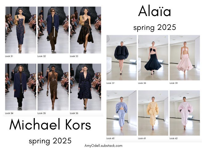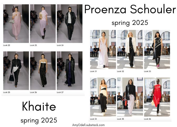The spring 2025 fashion shows walking now are not exactly Shiv Roy in an oatmeal knit that could be Loro Piana or Armani or The Row. Fashion is evolving from that look, be it Shiv’s upscale professional suits or Kim Kardashian’s beige, tight stuff. That said, the collections have not quite reached the point of full-on maximalist glitz, as seen recently on Jennifer Lopez at the Toronto International Film Festival premiere of her movie Unstoppable. The Tamara Ralph disco ball gown held together at the sides and shoulders by big, luxurious, floppy black bows was a revenge dress of the highest order.