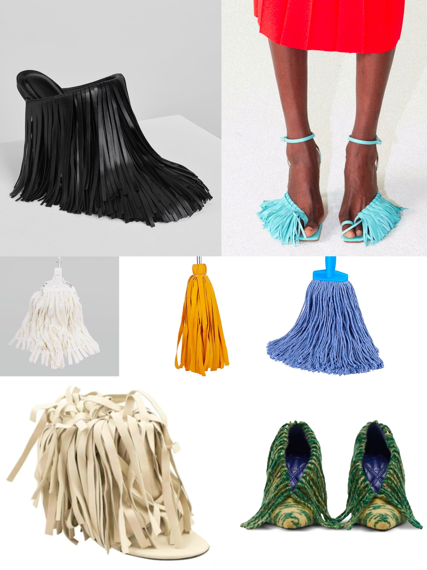 The balloon pumps we saw on the Loewe spring 2023 runway have spawned all kinds of shoes that look mops. Phoebe Philo did a pair I quite like in black. A.W.A.K.E. MODE has a pair that expose only the little toes and have mop fringe, as though they knew from the moment they were born their destiny was to be featured in this newsletter. And Burberry has some fringed shoes that manage to give both curtain and mop. I don’t like the Burberry ones, but otherwise I’m going to pledge my support for this impractical shoe.