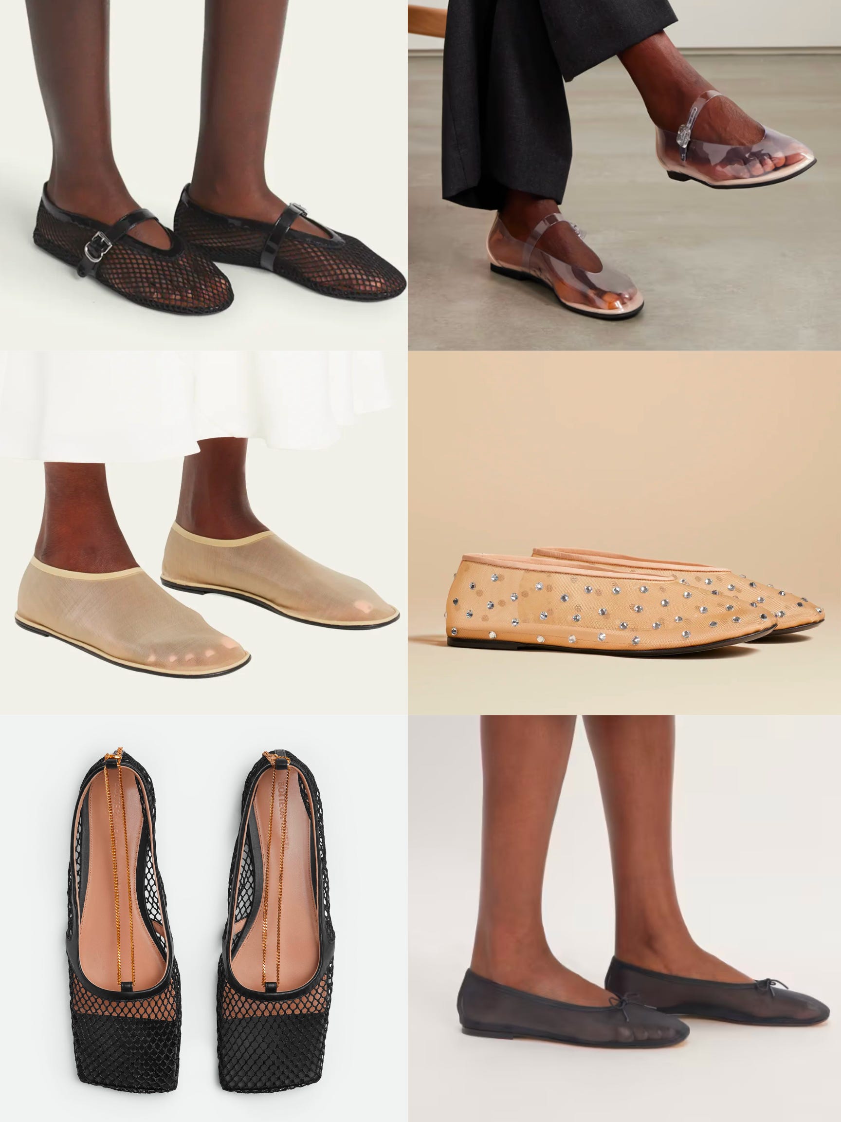 You can get different styles of mesh flats from the stealth wealth brands like The Row, Khaite, and Bottega Veneta. Citizen reviewers on TikTok and Reels often argue against these shoes, citing the unnecessary showing of feet. My eye has not quite adjusted to the ones that look like panty hose, and I don’t understand the clear PVC ones. Knockoffs are all over Amazon, Zara, and H&M.