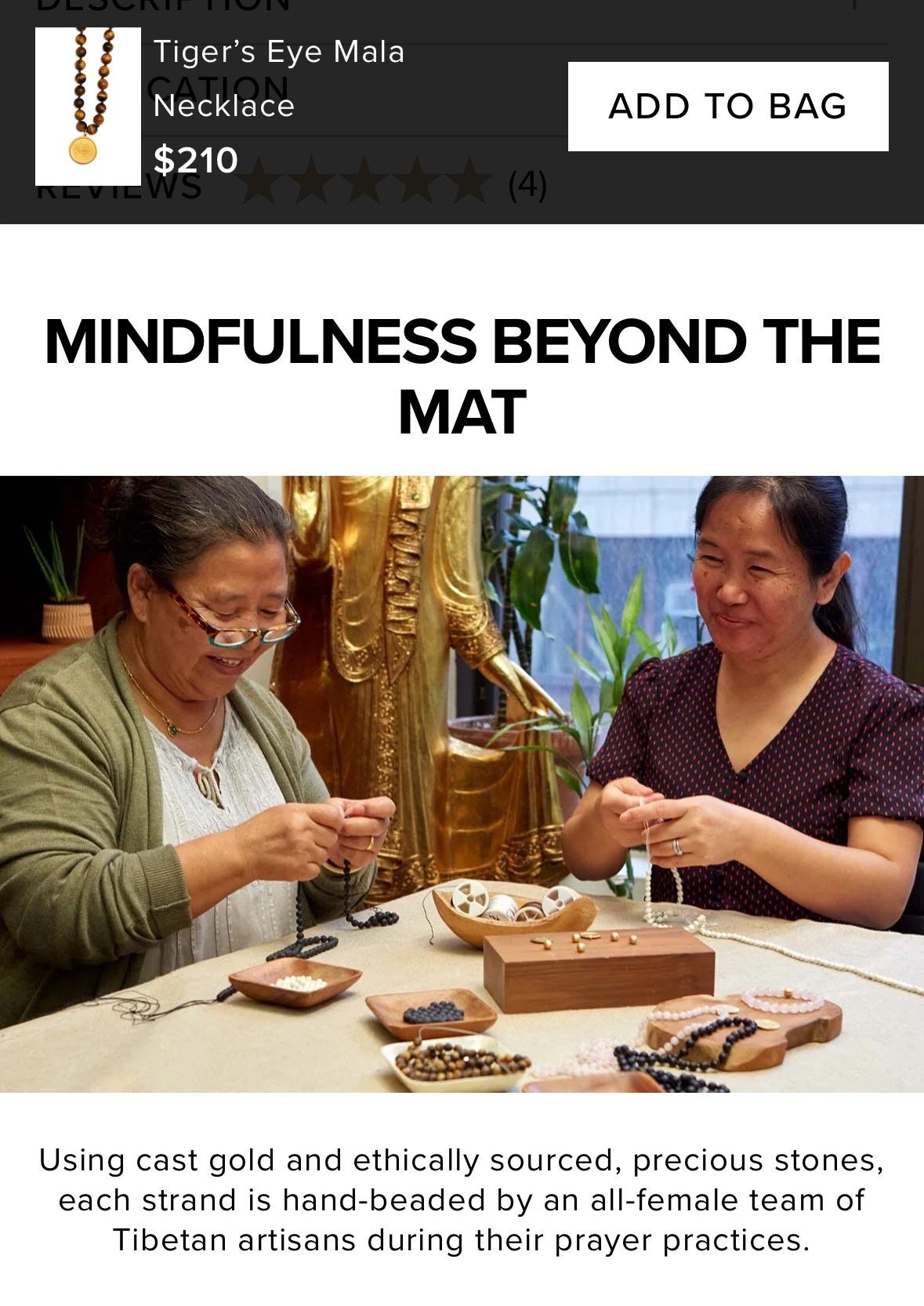 Alo Yoga, founded in 2007, has been doing this kind of thing for nearly 20 years. Alo portends to not just be a yoga-wear brand, it has also promised to “[take] the consciousness from practice on the mat and [put] it into the practice of life.” It now sells supplements, fitness classes, and, for $210, a Tiger’s Eye Mala Necklace “intended to help manifest grounding and balance.” The necklace has a gold-plated pendant that says “be here” on one side and “alo” on the other, along with a “circle of precious stones, each prayer-blessed during assembly by our all-female team of Tibetan artisans.”