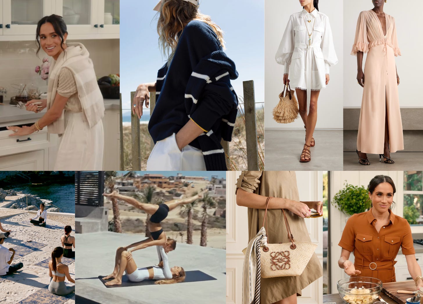 As Goldwyn described this look, I could picture it instantly, this aesthetic of luxury wellness. It’s Meghan Markle in the kitchen Netflix rented her in Montecito looking the most effortful version of effortless in neutral linen, earth-toned knits, button-down shirts, and hiking leggings. It’s a gauzy Chloé dress. It’s Zimmerman. It’s slouchy striped sweaters. It’s this little purse for your face serum. It’s a dry, rocky, landscape with wildflowers overlooking the sea, boxy architecture, and huge rectangular pools. I suggested to Goldwyn we call it “Montecito-core,” this Alo-fied version of stealth wealth, this designer raffia tote bag version of life. (I can’t speak for Goldwyn but, personally, I can’t help but like this look.)