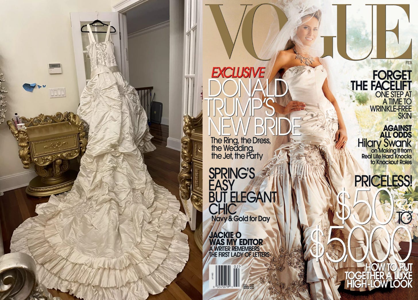The John Galliano Dior couture dress Melania wore on the cover of Vogue and to wed Donald Trump is on eBay for $45,000 or best offer. Liana Statenstein reports in Neverworns: “The seller said she was a friend of one of Melania’s friends who brokered the deal so she could buy it from Mrs. Trump. She purchased it for $70,000 for her own wedding back in 2011.”