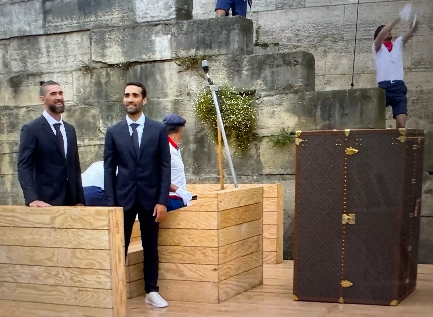 Perhaps the most grandiose of these inclusions was footage of a masked torchbearer in a Louis Vuitton workshop, witnessing the making of the monogrammed LV trunks that hold the medals. We then saw the creation of a gold medal, by LVMH jewelry brand Chaumet, which was placed in the LV trunk and lowered into a squad of dancers in front of LV HQ. The trunk was carted to a boat on the Seine carrying US Olympic swimmer Michael Phelps and French biathlete Martin Fourcade. The trunk then took its rightful place in the very center of the vessel, two of the most successful Olympians in history standing off to the side like backup dancers.