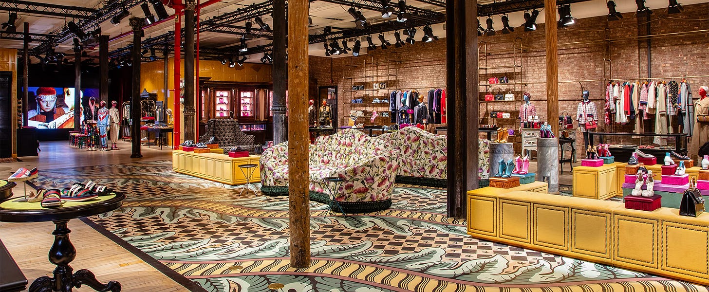 The Gucci store in Soho was originally conceived as a utopia sprung from the brain of former creative director Alessandro Michele. Salespeople were hired not because they could move product, but because they felt like a natural part of the environment, sort of a modern day beatnick coffee shop, where artists and cool people come together, except instead of folk musicians, special guests included Rihanna and A$AP Rocky, and instead of coffee, the store offered sparkling wine.