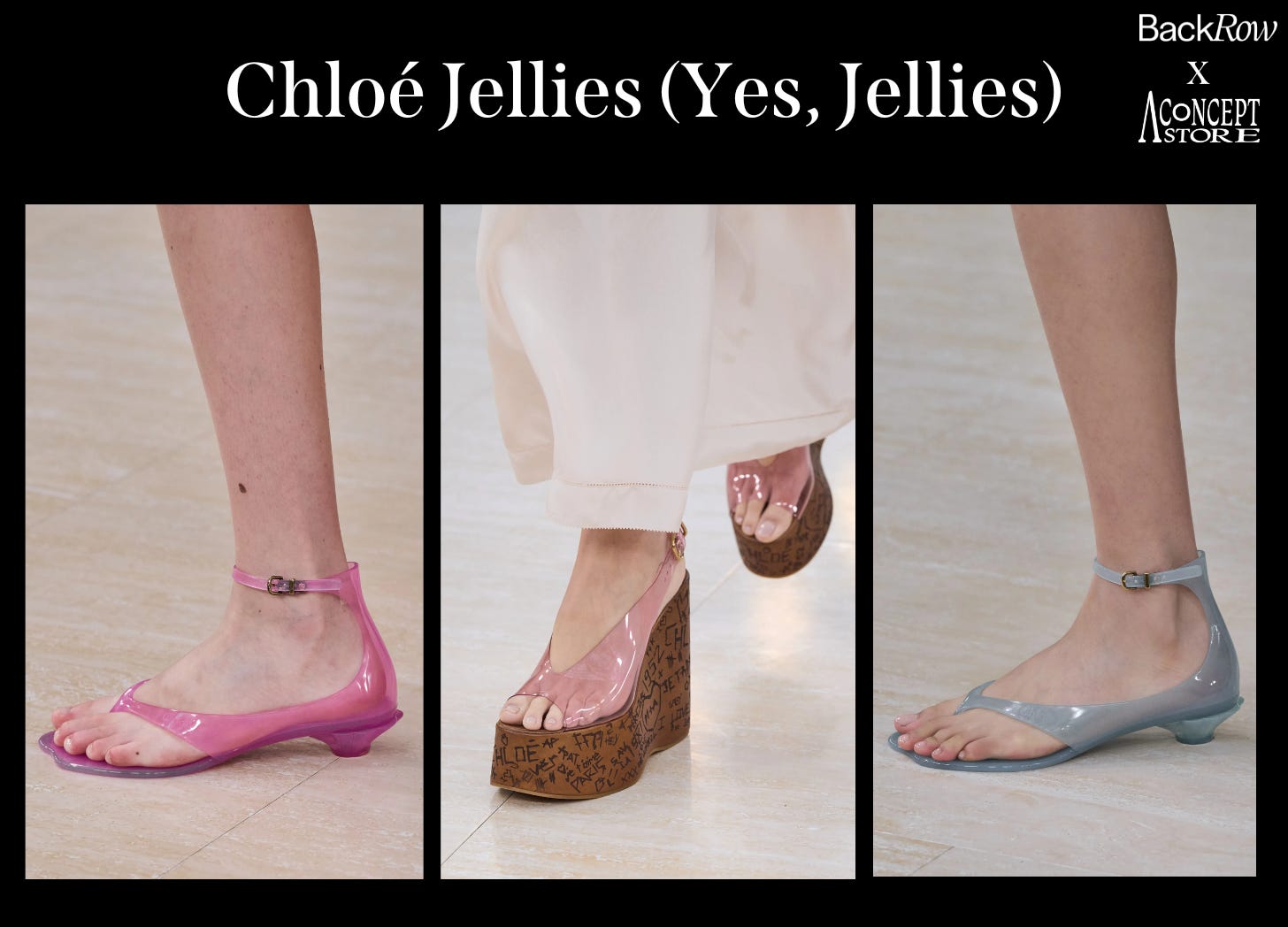 Chloé went viral by dressing all its front-row influencer types in those gigantic wooden platforms that could really do some damage to enemy shins. In Chemena Kamali’s second show, the brand iterated by showing those shoes in jelly material. Also in jelly material: flip-flop kitten heels, which almost look like a mistake, but will probably be knocked off everywhere. “Consider them the extension of the jelly sandals trend that popped up this summer,” said Diana.