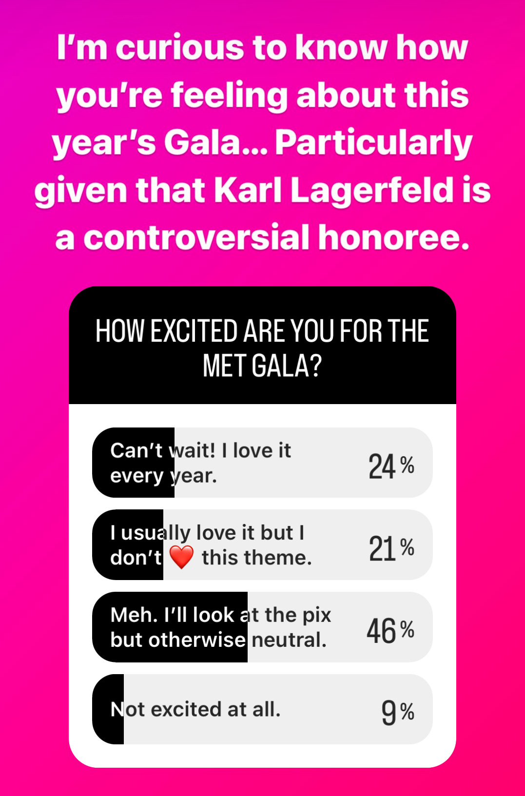 I also polled my Instagram followers, which is the largest audience I can personally easily poll, to get a temperature read on their sentiment toward this year’s gala. Nearly half of respondents said they’ll look at the pictures but are apathetic.