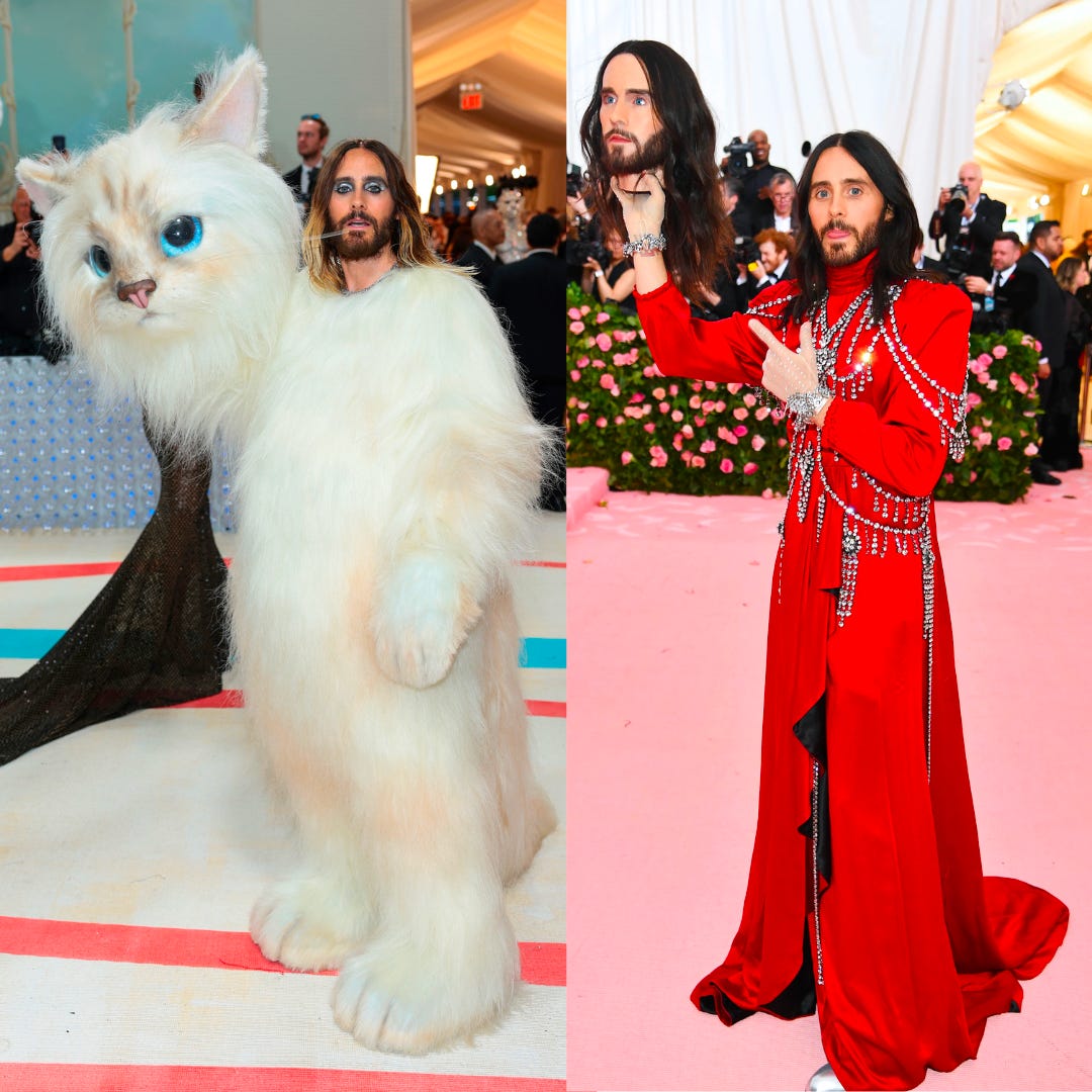 Up the stairs, the cat removed its head, revealing Jared Leto, who now has the distinction of having held two heads on the red carpet as part of his fashion moments for the Met Gala. (Previously, he held a replica of his own, as an ambassador for Alessandro Michele’s Gucci in 2019.) Leto is playing Karl Lagerfeld in a biopic of his life, which certainly put pressure on him to make a statement at the gala honoring him. Coupled with Doja Cat also coming dressed as a cat, it was a remarkable cat-washing of Karl’s legacy, which the Met and Vogue worked diligently over months to scrub perfectly clean for the consumption of the public who might not know much if anything about him.