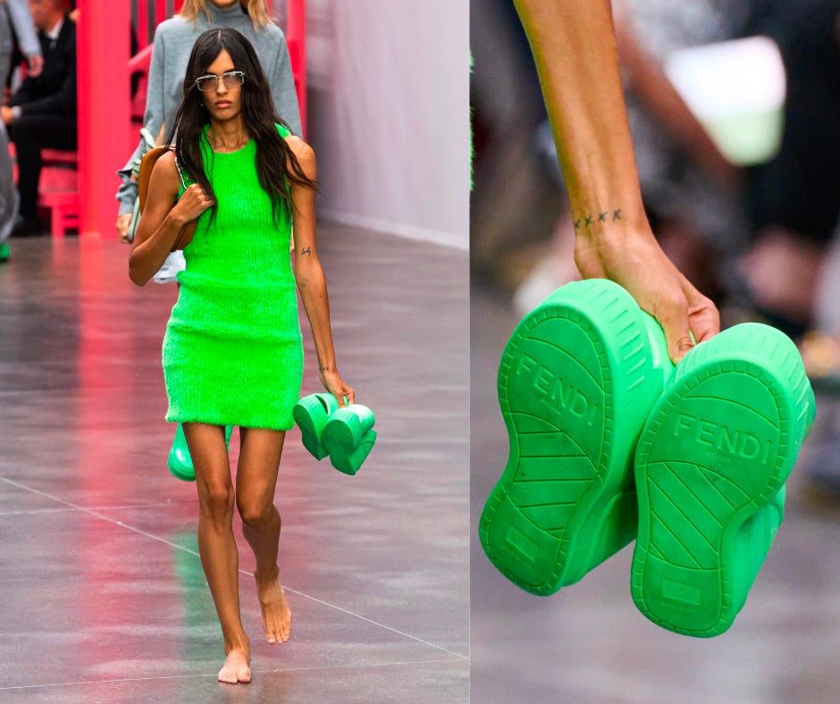 By the time we got to the Fendi show in Milan, things took a turn. A model in a fuzzy neon green knit mini dress appears in her Vogue Runway shot carrying her puffy platform slip-ons in her hand in a way that looks natural, like this is how it was supposed to be shown. But the reality was, TikTok revealed, she couldn’t walk in them.