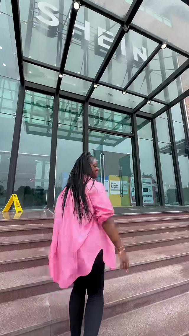 A month after the Tahoe trip, Carbonari was invited to China. She said Shein told her that they wanted to put an end to “rumors” about how they operate, and she wanted to see their facilities so she could “be confident” working with them. Plus, she’s a plus-size fashion influencer, and she’s not always included on trips like this. The first day they went to a supplier, the second an innovation center, and the third a warehouse. In between, they enjoyed fancy meals and luxury accommodations. Destene got to bring a plus-one, her husband Brandon.