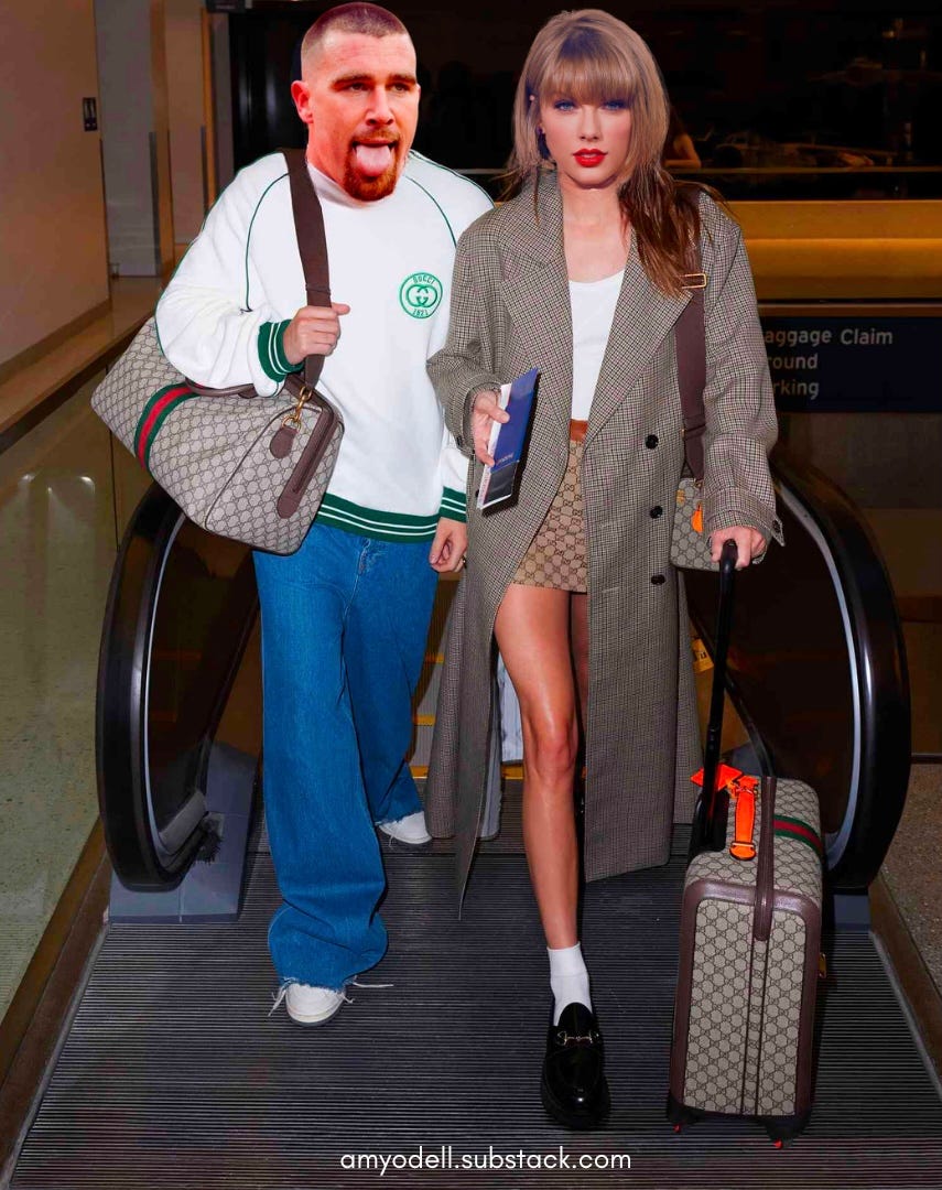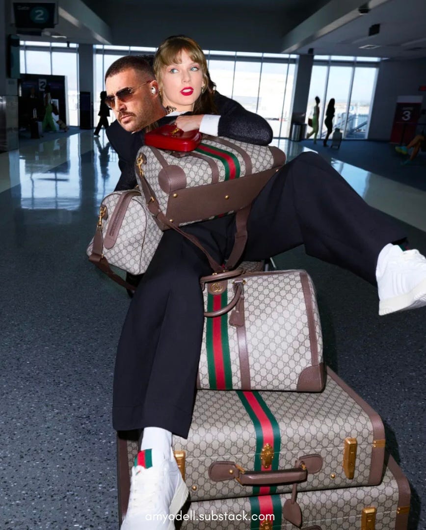 This much attention means that Kelce, now the sole tight end I can name and recognize, has practically overnight been rebirthed as a fashion influencer. If Gucci could rewind three months and vomit money at Kelce and Swift for the new luggage-oriented Ancora campaign featuring the charisma-less romance of Kendall Jenner and Bad Bunny, they most certainly would. The Swelce mania has been so intense that you probably forgot that was the famous couple about whom you were supposed to feel some sense of intrigue, to say nothing of Kylie and Timothée. Time for Kris Jenner to go back to the drawing board.